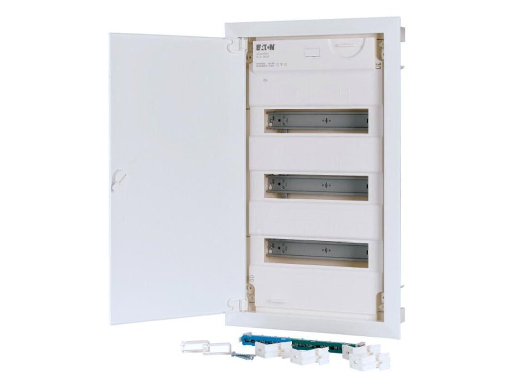 Bílá rozvodnice pod omítku EATON KLV-36UPS-F s plnými dveřmi má 36 modulů (3 řady po 12 M). Je vyrobena z plastu (stupeň krytí IP30) a rozměry činí 590 x 360 x 75 mm. Dodávka v provedení F zahrnuje dveře z ocelového plechu s dveřním rámem, vanu, montážní rám s přístrojovými lištami, svorkovnici N a PE, montážní úchytky pro rám s dveřmi, montážní návod a popisovací tabulky.