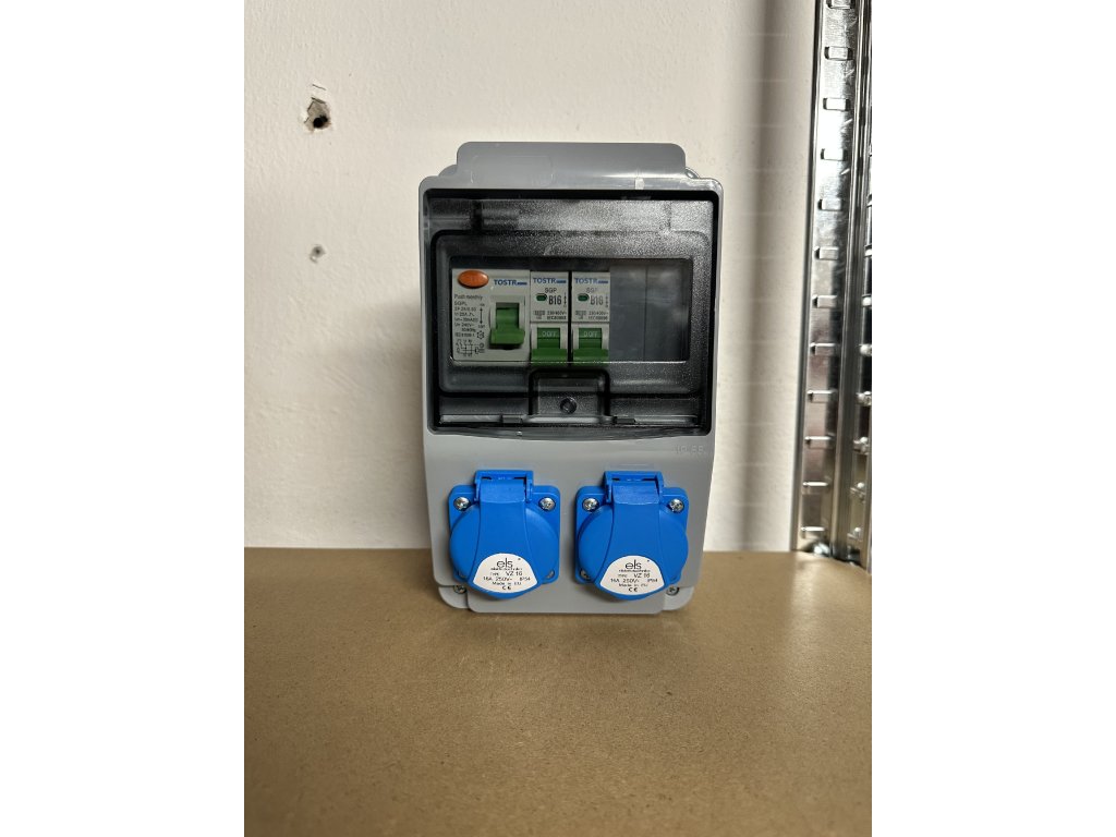 Zásuvková skříň jištěná 2x230V - proudový chránič 25/2/30mA,2x zásuvka 230V jištěno 2xB16/1. Kompletně vydrátované a zapojené