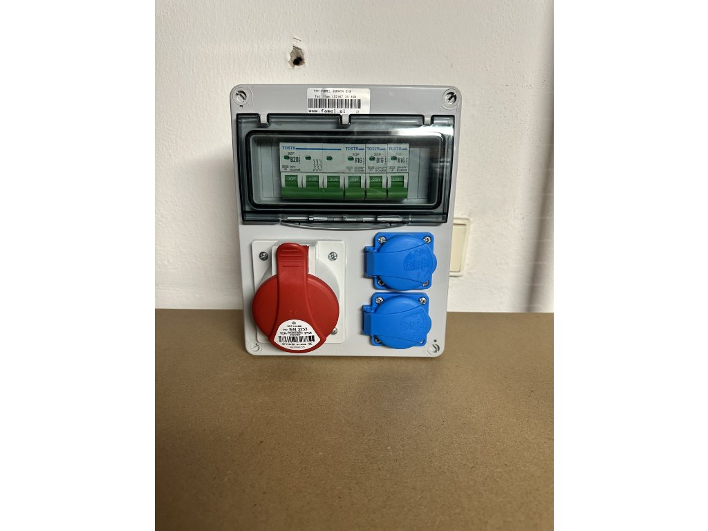 Zásuvková skříň 1x400V 2x230V: Jištění B20/3 - zásuvka 400V 32A 5ti kolík Jištění 2xB16/1 - 2x zásuvka 230V Jištění B16/1 - rezerva Kompletně vydrátované a zapojené